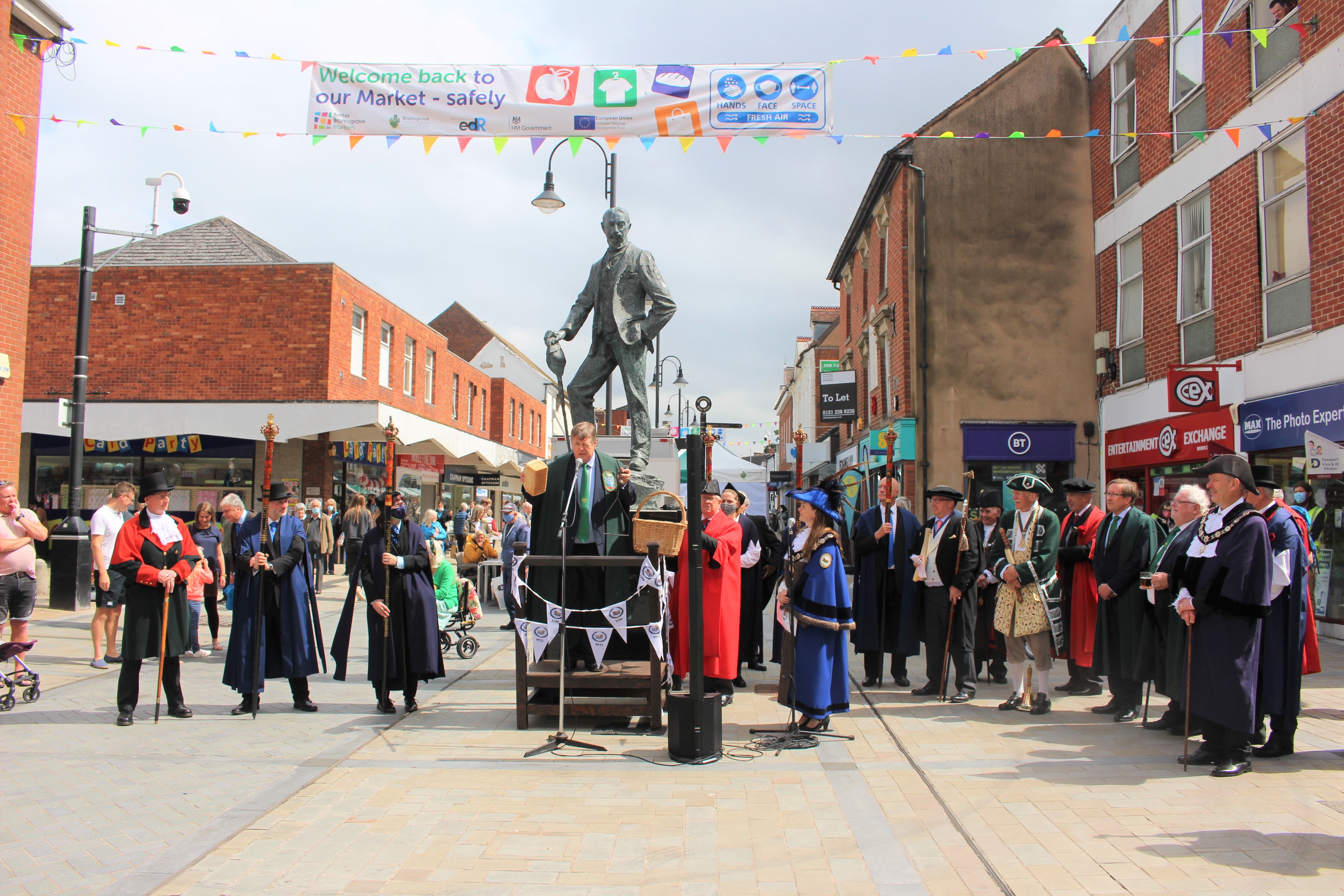 Colourful, traditional procession on Bromsgrove High Street followed by proclamation of the Charter by the Bailiff, Robert Bird, and assizes of goods offered for sale in the town at 11am by the Housman Statue.